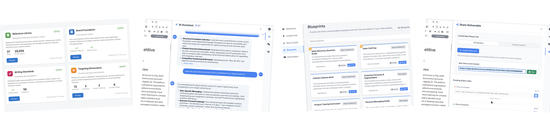 MarketCore's AI works alongside you inside the document. Edit directly, refine through conversation, and let teammates continue the same AI thread—so the reasoning stays with the work.